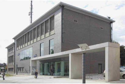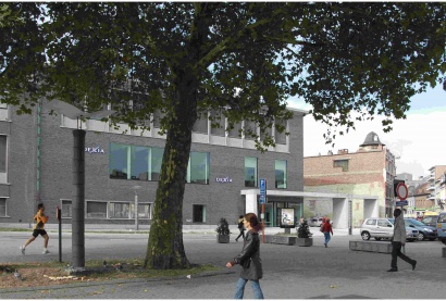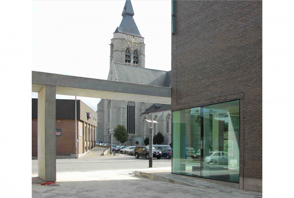 Dit project maakt deel uit van de Belgacomsite, gesitueerd op een markante hoek in het stadsweefsel. De vooruitgeschoven luifel in zichtbeton verbindt twee belangrijke stedelijke ruimtes: het Portaelsplein met de Lievevrouwekerk en de commerciële Lange Molensstraat. De luifel organiseert tegelijk de toegang tot de bank en de site.