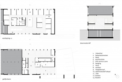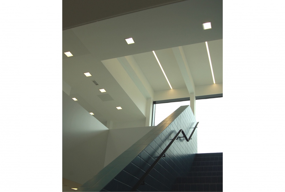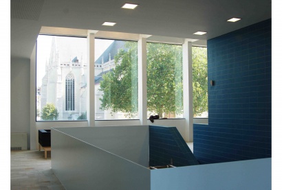 Het interieur herneemt de typologie en de ritmering van de grote en hoge ruimtes van de vroegere ateliers van Belgacom. Daglicht aan voor- en achtergevel versterken het ruimtelijk spel van witte en zwarte vlakken. De geborgenheid en ‘huiselijke sfeer’ van het interieur breekt open rond een royale vide met blauwbetegelde trappenpartij. Gekadreerde zichten van de Lievevrouwekerk trekken de stad binnen het gebouw en animeren de foyers en een ruime vergaderzaal op de verdieping.