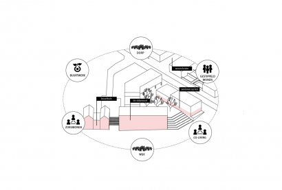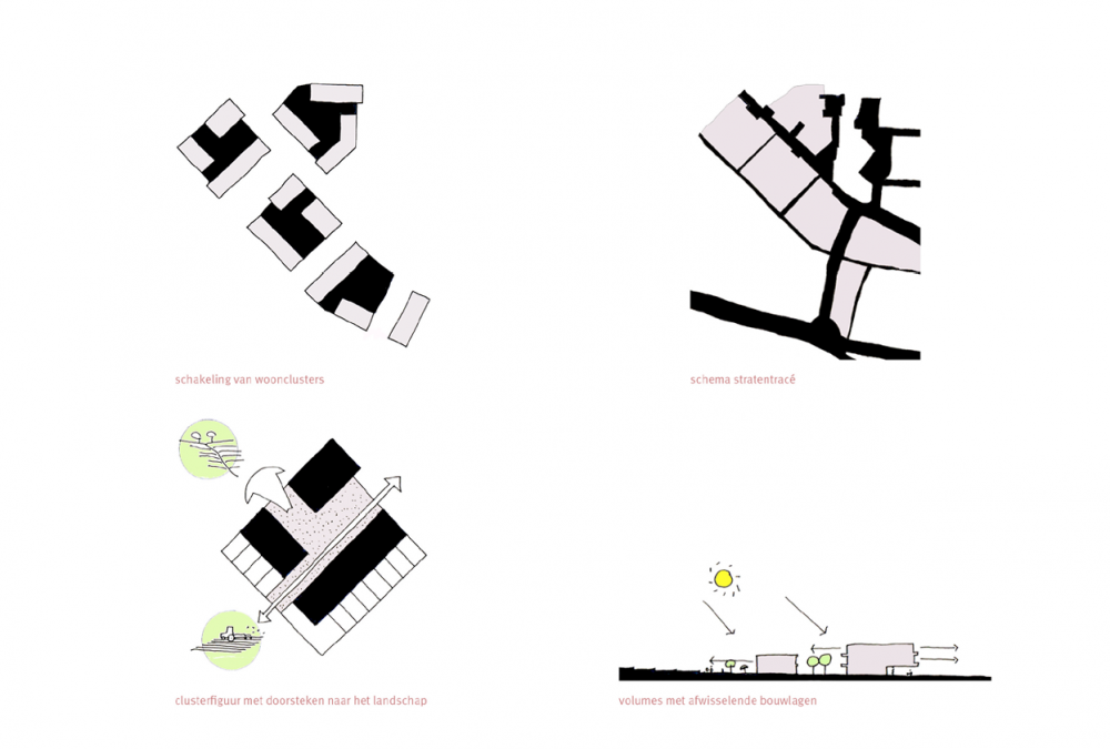 Wonen in clusters rond binnenhoven vormt het basisidee. Daarbij wordt erg ingezet op collectiviteit. Het landschap is collectief landschap: het moet kunnen doorlopen en iedereen moet ervan kunnen profiteren. De clusters worden daarom uitgedacht als poreuze clusters. Ze trekken het landschap binnen door te werken met verrassende doorzichten, doorwaadbare binnenhoven en fysieke connecties. De clusters worden gedraaid ten opzichte van elkaar, er is afwisseling tussen twee of drie bouwlagen en er wordt specifiek ingespeeld op de straathoeken. Binnen elke cluster worden de woonvolumes geschrankt, waardoor een binnenhof een constellatie wordt van één grote ruimte en twee kleinere. Kortom, elke cluster krijgt zijn eigen karakter.