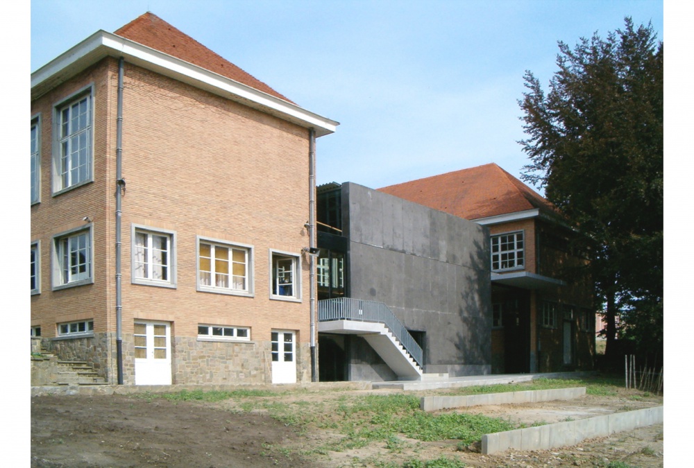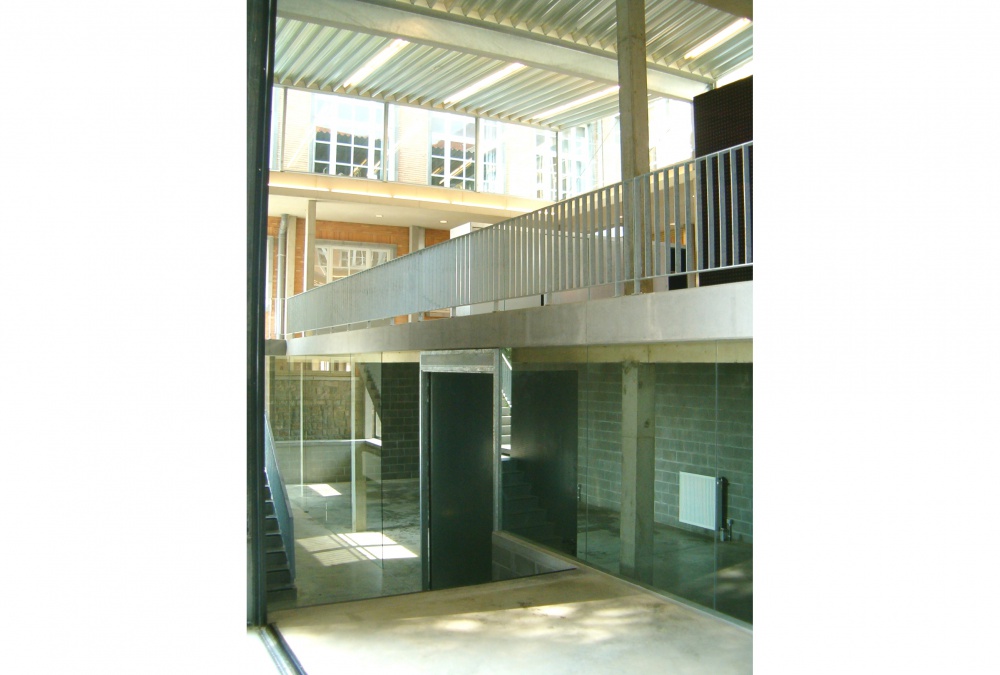 ‘(..) Kint ontwierp de uitbreiding als een industrieel, ruw afgewerkt object van zichtbeton, staal, glas en akoestische betonplexpanelen. Het gebouw dient dus niet te worden ontzien door de studenten. Die ruwheid staat echter in schril contrast met de subtiliteit van de ruimtelijke beleving. (...) Het creëert een fysieke en mentale openheid die een grote gebruiksvrijheid geeft.’