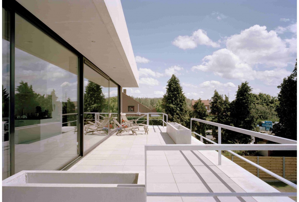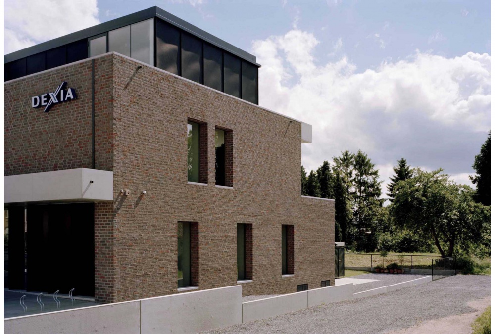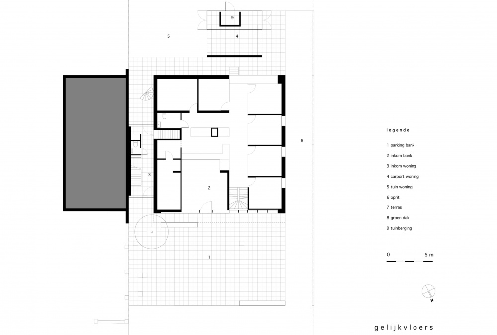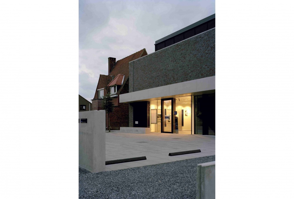 Het programma valt uiteen in twee componenten, een bank en een duplexappartement. De glazen pui van de bank trekt de aandacht en animeert de straatzijde in contrast met de massieve blinde muur van de verdieping. Het duplexappartement oriënteert zich volledig naar de achterzijde. Door de relatie tussen appartement, terras en tuin te versterken, versmelt deze tot één ruimtelijke entiteit.