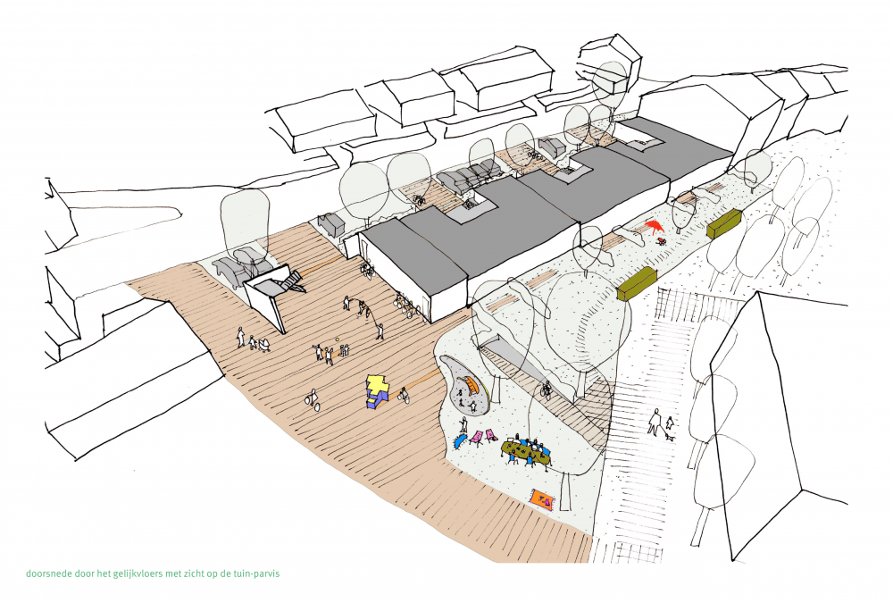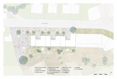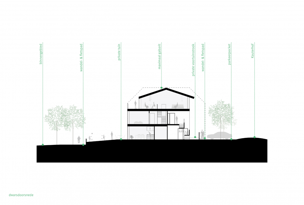 Sociaal wonen in de kern betekent een zoektocht naar een evenwicht tussen individualiteit en collectiviteit. Wij geloven dat het tijd is dat dit gedeelde verhaal ingebed wordt in de kavel als een meerwaarde voor zowel de bewoners als de woonstraat. Een nieuwe woon- en buitenplek voor iedereen; de verzamelplek met een sterke identiteit die mensen vervlecht. Om die beoogde woonomgeving, waar de intimiteit van het individuele wonen en de warmte van het samenwonen samengaan, vorm te geven zetten we in op een ruimtelijke strategie met drie ruimtelijke figuren. We genereren hiervoor een privacy gradiënt via een set van drempels in de opbouw naar een steeds intiemere, warme binnenwereld waar de prikkels van het samenleven afnemen en we introduceren drie ruimtelijke figuren die bemiddelen tussen het individuele wonen en het samen wonen: de voortuin, de inkompatio met de portiek en de tuin-parvis.
