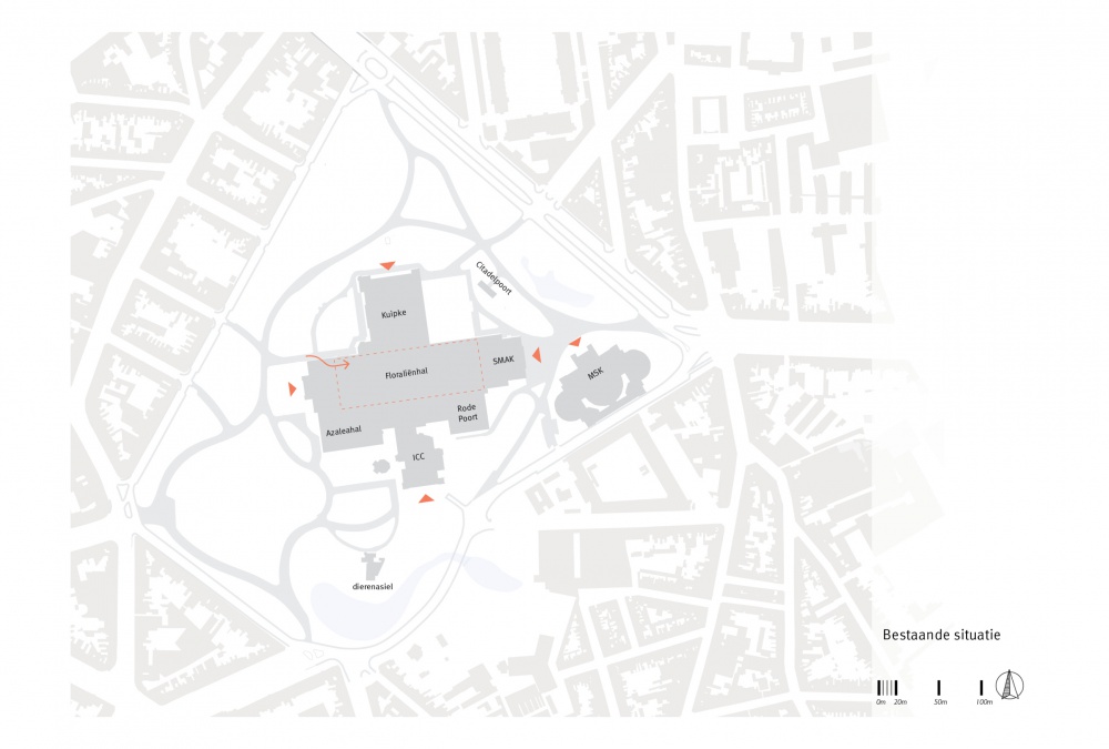 De Floraliënhal krijgt een vernieuwd leven als een parallelle 'lege' stedelijke micro-ruimte in het park. De focus verschuift van de gebouwen naar de compositie van de open ruimte. De wit-ruimte geeft ademruimte en garandeert een structurele flexibiliteit voor de omliggende culturele actoren die deze ruimte tijdelijk kunnen inpalmen.