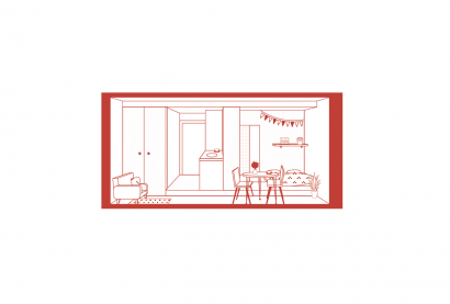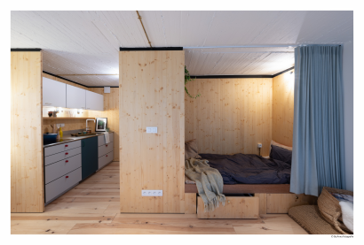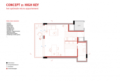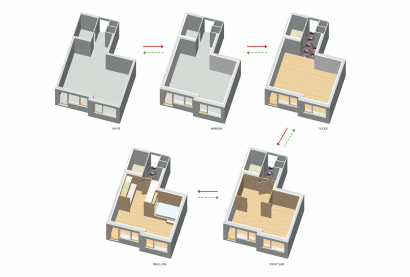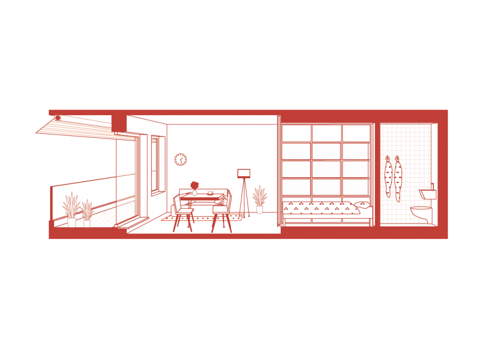 2. Een high-key scenario, waarin we resoluut kiezen voor een aangepaste indeling en waar alle materialen uit hergebruik komen of circulair zijn.